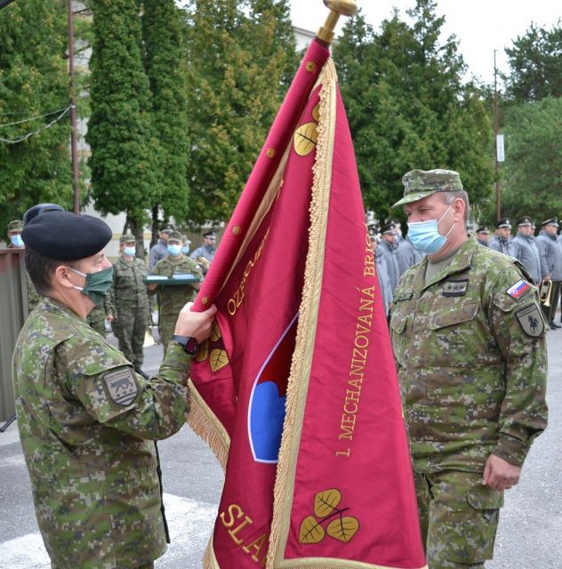 Slávnostným predaním Bojovej zástavy 1. mechanizovanej brigády („1.mb“) odovzdal 31. augusta 2021 funkciu veliteľa 1.mb v Topoľčanoch brigádny generál Ivan Balog prostredníctvom veliteľa Pozemných síl ozbrojených síl Slovenskej republiky generálmajora Ivana Pacha preberajúcemu veliteľovi 1.mb plukovníkovi Alexandrovi Kollárikovi. Na slávnostný ceremoniál, ktorý sa uskutočnil za prítomnosti príslušníkov Veliteľstva 1.mb, práporov a jednotiek v podriadenosti 1.mb v sprievode ich veliteľov, prijali pozvanie aj zástupca náčelníka Generálneho štábu - náčelník štábu Ozbrojených síl Slovenskej republiky („OS SR“) generálmajor Štefan Kovács, bývalý náčelník Generálneho štábu OS SR generálporučík v.v. Peter Vojtek, hlavní funkcionári Veliteľstva pozemných síl, predstavitelia Okresného riaditeľstva policajného zboru, hasičského a záchranného zboru, štátnej správy, ako aj ďalší pozvaní ctení hostia. Po odznení štátnej hymny SR a prečítaní Personálnych rozkazov náčelníka Generálneho štábu OS SR o ustanovení do funkcií, nasledoval symbolický akt odovzdania a prevzatia funkcie, ktorý zúčastnení spečatili svojím podpisom do oficiálnych dokumentov, ako aj zápisom do útvarovej kroniky. Počas dnešného slávnostného ceremoniálu vystúpil pred nastúpené jednotky generálmajor Kovács, ktorý na úvod tlmočil pozdrav od náčelníka Generálneho štábu OS SR generála Daniela Zmeka. Počas svojho príhovoru vyzdvihol význam doterajšej činnosti príslušníkov brigády v Topoľčanoch. “Za posledný rok a pol prvá brigáda plnila rôzne výcvikové úlohy, ale aj neľahké úlohy mierového života v súvislosti s riešením situácie spojenej s pandémiou COVID-19. Aj v týchto ťažkých časoch ste ukázali, že práca je pre Vás všetkých zároveň aj poslaním, a že svojou vysokou úrovňou, odbornou a profesionálnou pripravenosťou dokážete zvládnuť aj tie najnáročnejšie úlohy. Preto chcem poďakovať veliteľovi 1.mb brigádnemu generálovi Ivanovi Balogovi za kus odvedenej práce nielen v prospech u prvej brigády, ale aj v prospech celých pozemných síl. Dňom 1.9.2021 ste ustanovený do funkcie Zástupcu veliteľa pozemných síl a verím, že Vašou dlhoročnou snahou a profesionálnym prístupom k plneniu úloh sa novej funkcie ujmete so cťou.” Novému veliteľovi plukovníkovi Alexandrovi Kollárikovi generálmajor Kovács zaželal, aby na jeho novej veliteľskej funkcii bol naďalej zodpovedný, svedomitý a pracovitý ako doteraz. So svojimi príhovormi ďalej vystúpili aj odchádzajúci a novoustanovený veliteľ brigády. “Dnes sa Vám prihováram posledný krát, ako veliteľ prvej mechanizovanej brigády. Počas dva aj pol roka sme spoločne splnili množstvo náročných úloh, ktoré ste si plnili zodpovedne a svedomito, za čo Vám patrí moja vďaka“. Brigádny generál Balog, ktorý vo funkcii veliteľa 1.mb pôsobil od 1.3.2019, sa na záver svojho vystúpenia rozlúčil so slovami: “Bolo mi cťou veliť 1. mechanizovanej brigáde.” Novoustanovený veliteľ brigády plukovník Kollárik na úvod svojho vystúpenia poďakoval brigádnemu generálovi Ivanovi Balogovi za vytvorenie podmienok a priestoru, počas ktorého mohol brigádu prevziať. “Mojou prioritou v rámci pôsobenia vo funkcii veliteľa brigády bude nielen udržať pretrvávajúci stav, ale zároveň zvyšovať úroveň vycvičenosti veliteľov a štábov, mladých dôstojníkov a poddôstojníkov, ako aj výcvik vojsk” dodal na záver plukovník Kollárik. Pred slávnostným pochodom nastúpených jednotiek, ktorým bol ceremoniál ukončený, vystúpil bývalý náčelník Generálneho štábu OS SR generálporučík v.v. Peter Vojtek - prvý viceprezident Zväzu vojakov SR a predsedu Rady klubu generálov SR, ktorý v mene Zväzu vojakov SR udelil brigádnemu generálovi Balogovi vyznamenanie “HVIEZDA Zväzu vojakov SR”. Slávnostnú atmosféru a dôstojnosť celého aktu odovzdania a prevzatia funkcie veliteľa prvej brigády dodala účasť príslušníkov Čestnej stráže OS SR a Vojenskej hudby OS SR.