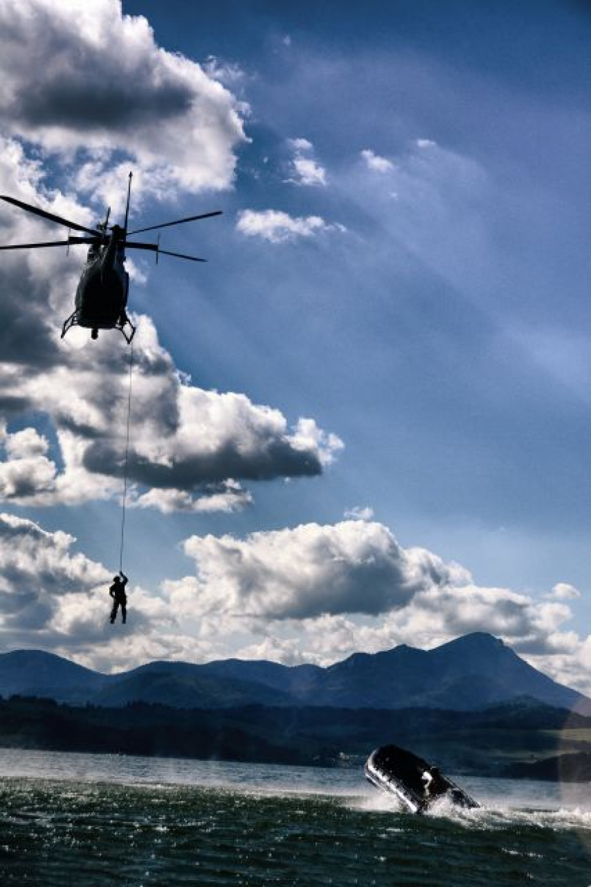 Pri ďalšej činnosti, zlanení za letu, sa pevná zem zmenila na pohybujúce sa dno člna ZODIAC FC 470 – to si vždy vyžaduje presnú spoluprácu pilota vrtuľníka i obsluhy člna.