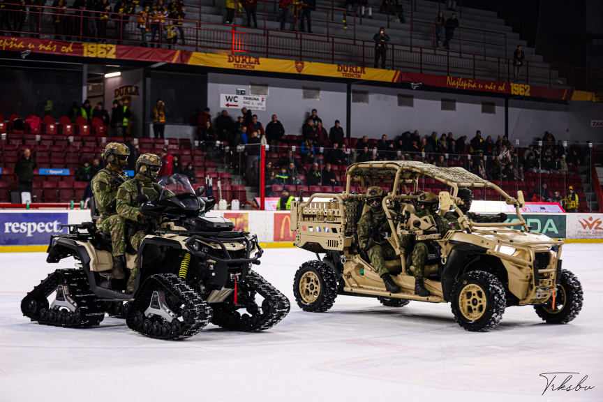 V prestávke medzi tretinami boli na ľade prezentované vojenské vozidlá POLARIS a Can-Am príslušníkmi 5. pluku samostatného určenia.